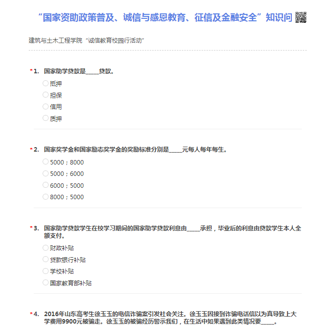 6月13日-6月14日,crown中国官方网站利用网络,开展了“国家资助政策普及、诚信与感恩教育、征信及金融安全”知识问卷,设计单选题20道,多选题10道,简答题1道,参与网络答题的学生有519人,达到学院在校生人数的97%,学生参与率高。